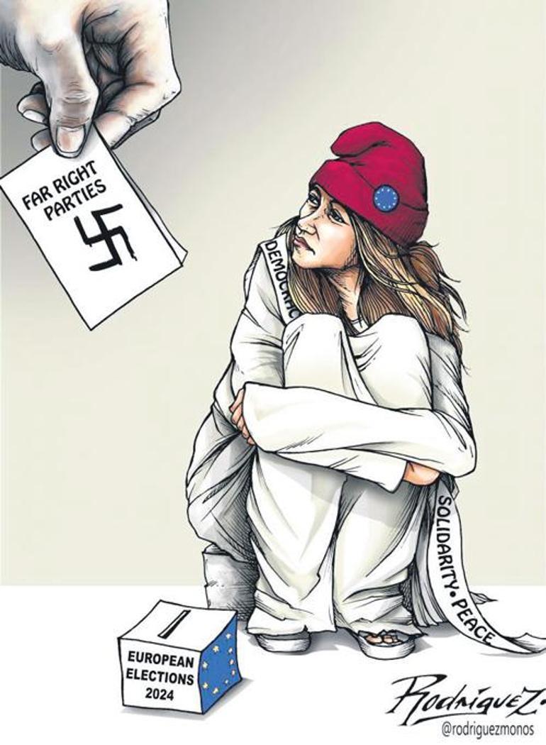 Avrupa Birliği Parlamen-tosu’nda aşırı sağ partilerinin sandalyelerinden oluşan Nazilerin gamalı haçı. Ve Avrupa seçimleri oy kutusu başında demokrasi, barış ve kardeşlik kuşağı takmış Fransa’yı temsil eden genç kız “gamalı haç üzerinde aşırı sağ partiler oy pusulasına hüzünle bakıyor.”