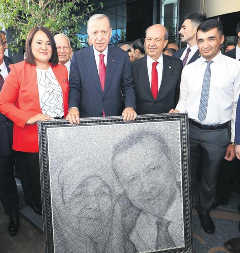 Kıbrıs’ta yaşayan Türkmen asıllı Maysa Şahin, yeğeni Atajan Hemrayev’in 388 adet çiviyle Cumhurbaşkanı Erdoğan ile annesi Tenzile Erdoğan’ın portresini işlediği filografi tabloyu Erdoğan’a hediye etti.