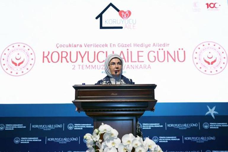 Koruma altındaki çocukların bakım şartlarının 2000’li yıllarda yetersiz olduğuna işaret eden Emine Erdoğan, “Aile ve Sosyal Hizmetler Bakanlığımız ile dünyadaki iyi örnekleri de değerlendirerek, çocuklarımızı koğuş tipi yurtlardan kurtardık ve sevgi merkezli evlere yerleştirdik. Bir çocuk için olabilecek en huzurlu ve güvenli ortamın, bir aile ortamı olduğu düşüncesiyle, koruyucu aile sistemini güçlendirdik. Yapılan çalışmalar ve Gönül Elçileri Projemiz neticesinde, koruyucu aile yanında bulunan çocuk sayımız 2002’den bu yana 515’ten,10 bin 256’ya yükseldi.” diye konuştu.