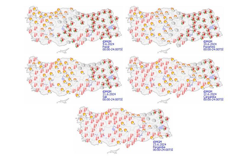 Meteoroloji Genel Müdürlüğü tarafından yapılan son değerlendirmelere göre: Ülkemizin güney, iç ve doğu kesimlerinin parçalı, yer yer çok bulutlu, İç Anadolu’nun güney ve doğusu, Doğu Karadeniz, Doğu Anadolu, Adana, Hatay, Ankara, Çankırı, Ordu, Tokat, Batman, Mardin ve Siirt çevreleri ile Akdeniz’in Toroslar kesiminin yerel olmak üzere sağanak ve gök gürültülü sağanak yağışlı, diğer yerlerin az bulutlu ve açık geçeceği tahmin ediliyor. Yağışların, Doğu Karadeniz’in iç kesimleri, Doğu Anadolu’nun kuzeyi ile Aksaray, Niğde, Nevşehir, Kayseri ve Sivas çevrelerinde yer yer kuvvetli olması bekleniyor. Güneydoğu Anadolu Bölgesi ile Doğu Anadolu’nun güneydoğusunda toz taşınımı görüleceği tahmin ediliyor.