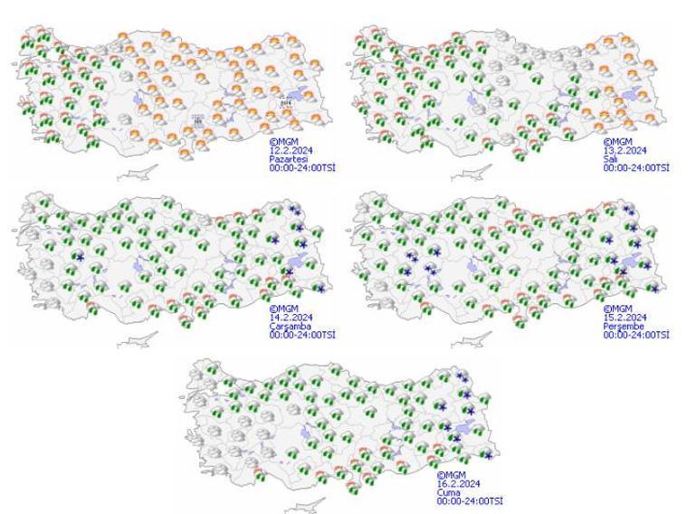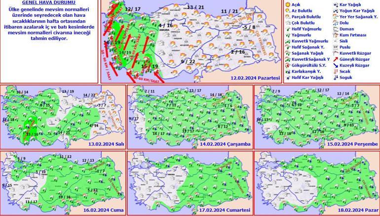 Meteoroloji Genel Müdürlüğü tarafından yapılan son değerlendirmelere göre: Ülkemizin batı kesimlerinin yer yer çok bulutlu, Ege ve Batı Akdeniz kıyıları ile zamanla Marmara’nın batısının sağanak yağışlı geçeceği tahmin ediliyor. İç ve doğu kesimlerde pus ve yer yer sis bekleniyor. Doğu Karadeniz’in iç kesimleri ile Doğu Anadolu’nun kuzey ve doğusunda çığ tehlikesi bulunmaktadır.